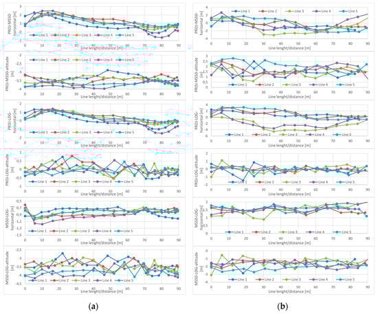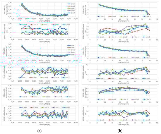 - coordinate differences between the values measured by the MS50 instrument and obtained from the data stored in the LOG files of the UAV on-board computers, denoted as MS50-LOG: