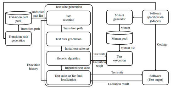 In this study, test-suite generation was divided into two phases: fault-detection test-suite generation and fault-localization test-suite generation. The fault-detection phase determines whether a fault existed. Then, a test suite was generated for fault localization and a test path with a coverage that was advantageous for fault localization was proposed. The TP was generated based on the authors’ previous study [10].