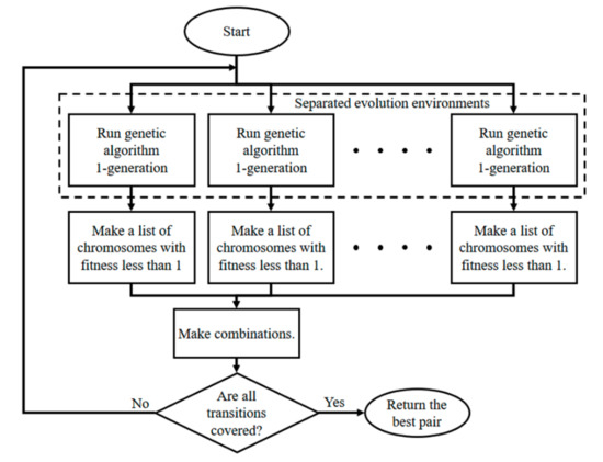 Figure 3 shows the organization of the separated genetic algorithm environments. In the same evolution environment, the solution tends to converge to a single point; therefore, it can be difficult to achieve total coverage. The TPs in a separated environment evolve into different forms, and it is easier to achieve coverage of all transitions. When the first round of the evolution process is completed, a list of the TPs that evolve in each environment with a fitness value of less than 1 (i.e., the FTPs) is generated. The evolution process is repeated until a pair that covers all transitions exists between the combinations that can be generated by selecting one from each FTP list. If multiple pairs are found, then the best pair is returned. If a higher-quality FTP is desired, it is possible to use a method that repeats the evolution until the TP pairs that meet the criteria show no improvement for at least a fixed number of generations.