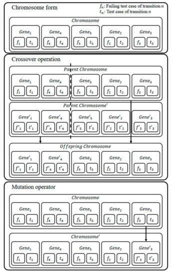 To generate a test suite that meets the goals of Phase 1 and Phase 2, it is necessary to improve the solution using genetic algorithms. Figure 4 shows the chromosome forms and genetic operators used in this study. In the chromosome-initialization phase, the chromosomes (test suites) are composed of genes that respond to each transition according to the transition order of the given TP, and each gene is composed of a failing test case and a test case. The gene’s test case and failing test case are randomly assigned to one of the boundary values generated.