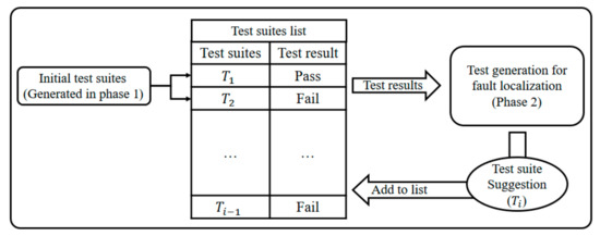 The goal of Phase 2 is to generate test suites that can perform fault localization when one or more test suites fails during Phase 1. Figure 5 shows the test-suite generation process for Phase 2. This phase makes it possible to propose the next test suite for fault localization, based on the results obtained from the Phase 1 test suites, and to perform fault localization with a small number of test suites. Firstly, the next test suite () is created based on the execution results of the test suites created in Phase 1 or previously executed test suites (,). The test suite () is added to the list, and the next test suite () is created based on all of the executed test suites (). This process can be repeated as many times as the test designer wishes (e.g., suspiciousness value, number of repeats).