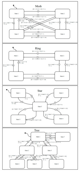 To confirm the effectiveness of the proposed method, tests were performed on four state charts. Figure 6 shows the four state charts used in this study. Star, ring, mesh, and tree state charts were constructed to perform experiments with a variety of forms. The star, ring, mesh, and tree forms were borrowed from different types of network organization and selected to confirm whether fault localization was affected by various organizational forms.