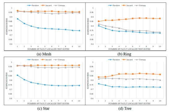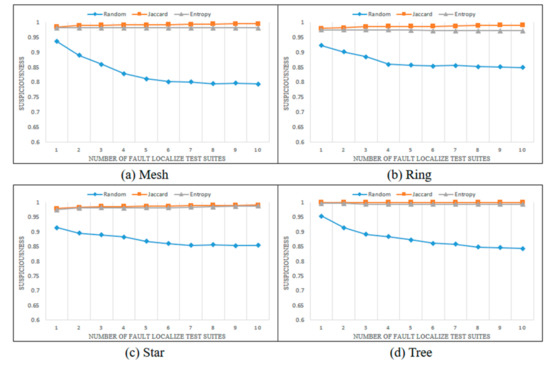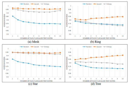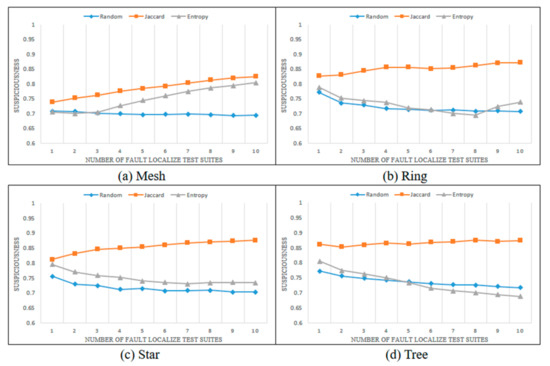 Figure 7, Figure 8, Figure 9 and Figure 10 show the changes in the suspiciousness of faulty statements when executing weak, resistant, hard-to-kill, and non-mutant test suites, respectively. Each time a test case generated by each method is executed, a trend in the suspiciousness of a faulty statement may be noted. This allows evaluation of how efficiently the test cases generated by each method increase the suspiciousness of the faulty statement. Figure 7 shows the results of the weak case in each state chart. In general, there were almost no performance differences between the Jaccard distance and lookahead entropy methods. In the random test suites, the suspiciousness was low during each execution. Figure 8 shows the results of the resistant cases for each state chart. The mesh and star state charts exhibited similar trends to the weak case; however, in the ring and tree state charts, the trend in the lookahead entropy was the same as that of the random method, in which the suspiciousness decreased as the test suites were executed. Figure 9 shows the changes in suspiciousness in each state chart for hard-to-kill cases. When the Jaccard distance was used, the suspiciousness tended to increase. However, when the lookahead entropy method was used, the suspiciousness did not increase in any state charts except for the mesh. Figure 10 shows the changes in the suspiciousness of each state chart for the non-mutant cases. When the Jaccard distance was used, the suspiciousness tended to increase while the rest decreased. Overall, there were no significant differences between the performances of the Jaccard distance and lookahead entropy methods when the faults had low difficulty levels, but the performance of the Jaccard distance method improved as the fault difficulty increased.