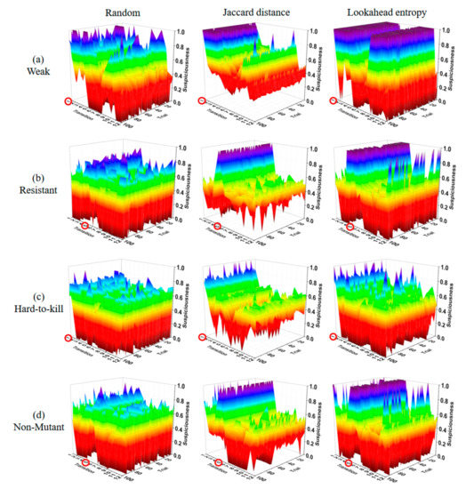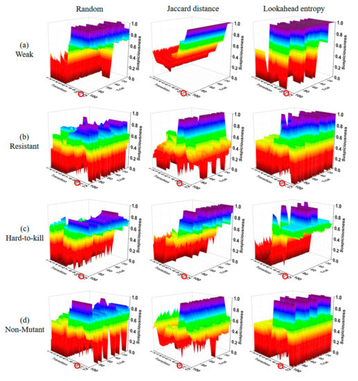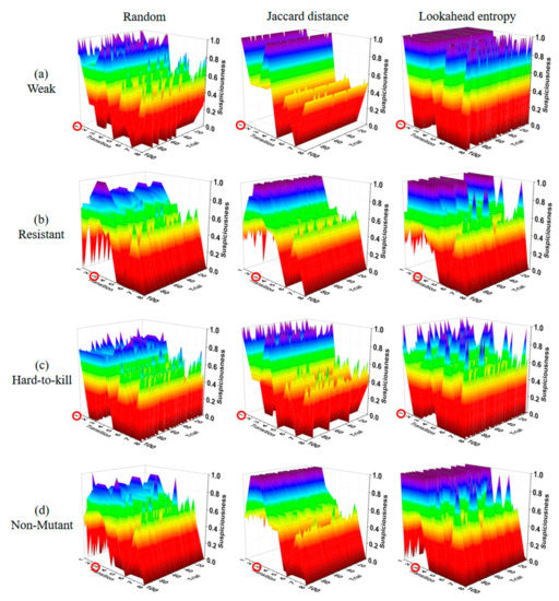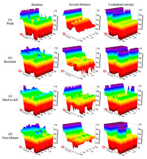 Table 4 shows a summary of all of the experimental results. , , and are the suspiciousness values of faulty statements calculated after performing 10 test suites generated using the random, Jaccard distance, and lookahead entropy methods, respectively. Suspiciousness represents the performance index of each method. A value closer to 1 indicates better performance. The suspiciousness was calculated using the tarantula suspiciousness metric [20]; avg is the average final suspiciousness value of the 100 experimental rounds, and max and min are the maximum and minimum values of the final suspiciousness values. In the table’s difficulty column, W refers to weak, R to resistant, H to hard-to-kill, and N to non-mutant. The numbers inside the parentheses show the number of test cases that killed the mutants out of 2500 random test cases.