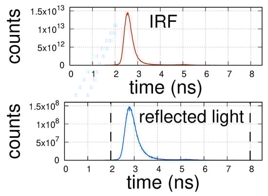 In this section, we consider time-resolved measurements for a phantom. The solid phantom (biomimic optical phantom) is made of polyurethane to simulate biological tissues (INO, Quebec, QC, Canada). The absorption coefficient and reduced scattering coefficient are and at wavelength 800 nm. The refractive index of the phantom is . The measurements were performed by the TRS (time-resolved spectroscopy) instrument (TRS-80, Hamamatsu Photonics K.K., Hamamatsu, Japan). Two optical fibers from TRS-80 are attached on the top of the phantom with the separation (). The phantom is illuminated by near-infrared light of the wavelength through one optical fiber and the reflected light is detected by the other optical fiber. The time interval of the measured data is and we used the data from to (). Measured counts, i.e., the number of photons, are shown in Figure 1. The upper panel of Figure 1 shows the instrument response function (IRF), which is given as a property of the experimental device. The measured reflected light is shown in the lower panel of Figure 1. The function is the instrument response function divided by the maximum value of the measured reflected light. The peak of q is at . is the measured reflected light normalized by its maximum value. In the lower panel of Figure 1, and are marked by vertical dashed lines. The size of the phantom is large enough that we can assume the three-dimensional half space. Then the energy density of the detected light is computed by Equation (6). The parameter ℓ is obtained from Equation (3).