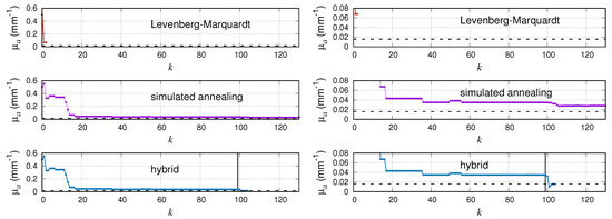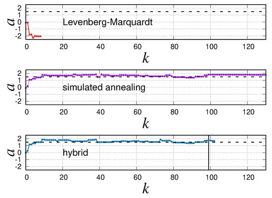 The results for and are shown in Figure 3 and Figure 4, respectively. In Figure 3, reconstructed values of are plotted against the iteration number k. In the top panel of Figure 3, we see that Algorithm 1 (LM) quickly converges. In Algorithms 2 and 3, we set . As is seen in the middle panel of Figure 3, the convergence of Algorithm 2 (SA) is slow. The temperature is decreased from to at the th Monte Carlo step. Similarly, is changed from to . Algorithm 2 returns the correct values after many Monte Carlo steps; we have for , respectively, when and . Finally, in the bottom panel of Figure 3, we see that the iteration of Algorithm 3 (hybrid) immediately converges after we switch from the Metropolis–Hastings MCMC (, ) to Algorithm 1 (LM). No convergence of the Monte Carlo chain is required, and we found for and for (, ). A similar behavior is observed for the reconstruction of in Figure 4. In the top panel of Figure 4, we find that Algorithm 1 (LM) works best and converges after a few iterations, whereas Algorithm 2 (SA) in the middle panel of Figure 4 has slow convergence and reconstructed values around at are still away from in (42). By switching from MH-MCMC to Algorithm 1 (LM) using Algorithm 3 (hybrid), convergence is easily obtained as shown in the bottom panel of Figure 4.