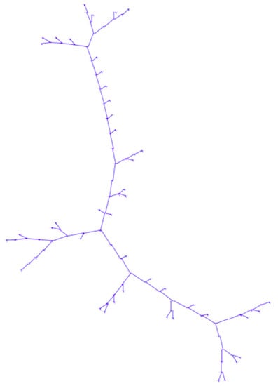 Table 1, Table 2 and Table 3 present the technical characteristics and the configuration of the distribution network under study [34]. An abstract graphical representation of the network is provided at Figure 1. The voltage level of the grid is 20 kV, the total length is 55 km and the installed capacity is 12 MVA. The network includes 45 20/0.4 kV distribution transformers and 24 renewable energy sources plants (photovoltaics). The resistance and the reactance of the conductors is R = 1.268 Ω/km and X = 0.422 Ω/km for ACSR 16 mm2, R = 1.071 Ω/km and X = 0.393 Ω/km for ACSR 35 mm2 and R = 0.215 Ω/km and X = 0.334 Ω/km for ACSR 95 mm2. In order to improve the performance of this line [34] and to demonstrate the capability of the proposed method suitable for meshed networks, it is being reinforced in a meshed manner, connecting the nodes 51 and 84 using ACSR 95 mm2 conductors. The distance between these nodes is 8 km, creating a resistance of 1.72 Ω and impedance of 2.672 Ω, or pu resistance and impedance 0.43 pu and 0.668 pu, respectively.