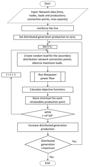 Figure 2 depicts the flow chart of the developed calculation procedure. The algorithm creates randomly possible loading for all transformers feeding the low voltage part of the distribution network and perform power flow analysis. Then, the values of the objective functions are calculated, and this algorithm reiterates 4 million times. The above procedure is being repeated for distributed generators production from 0 to full of their installed capacity in 1/10 steps of the maximum value.