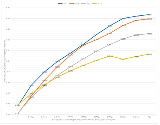 Simulation results have shown that in order to achieve the maximum possible total loading without substantially compromising voltages across the line, the transformer that feed the low voltage distribution system has to have the calculated load. Table 5 and Figure 3 show the calculated values for the objective function for each case; the values are increasing when the production from the renewables also increasing, since more load is able to be fed to the low voltage network distribution transformers without decreasing voltage at all points. The production is able to feed nearby loads; hence, the total load served is increasing without severely affecting voltage drop. The higher increase is observed when voltage drop has higher weighting factor for the case 1 and lower for case 4. The graphical representation of this interrelation shall normally provide perfect curves; however, due to the probabilistic approach applied, there could be minor rounding errors that do not substantially affect the results. The source code for this publication has been written on Matpower 6.0 [36,37] and Mathworks Matlab 2017a [38]. The Monte Carlo simulation was run on Aris high performance computing [39].