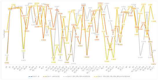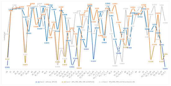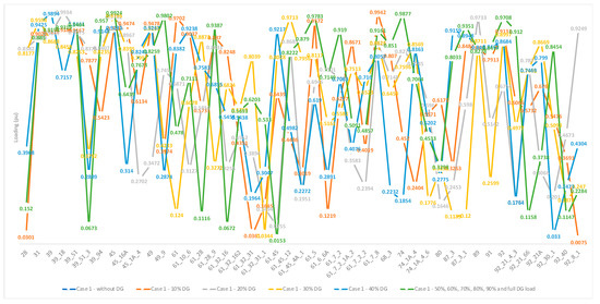 Considering case 2 (Table 7 and Figure 5), similar results are being observed. The proposed load for several transformers (15, 40, 49, 50, 69, 75, 92, 94, 99, 101) does not exceed 70% of their installed power at any production from the renewable energy sources. Similarly, the proposed load of the transformers 1, 40, 46 and 71 for case 3 (Table 8 and Figure 6) and 1, 7, 10, 12, 14, 16, 59, 61, 64, 66 and 98 for case 4 (Table 9 and Figure 4) does not exceed their installed power capacity. Note that these nodes are the points that are expected to receive more attention for downscaling and/or line reinforcing. Added to the above, it is necessary to highlight the impact of the considered distribution generation (DG) on the obtained results. In cases 1 and 3, the loading per node for DG from 50% to 100% of the installed capacity does not change. In case 2, DG from 20% to 100% provides the same results, since for case 4, the distribution generation does not affect the proposed loading of each transformer.