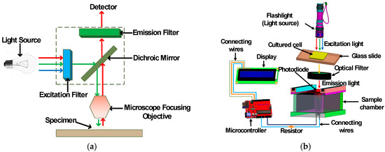 The combined advancement in the field of molecular biology and optics has revolutionized the investigation methods used in the field of biology and chemistry. The progress in fluorescence microscopy and molecular tagging has also enabled the pathways to analyze the dynamics of cells with molecule-specific contrast [1,2]. In recent years, these fluorescent microscopes have garnered a lot of attention, as they offer multiple benefits and possibilities including live-cell imaging, high-resolution images and localization of fluorescence in cells. However, these fluorescent microscopes are expensive as they use sensitive and sophisticated equipment/parts [3] making it affordable only to hospitals/institutions with sound financial resources. These microscopes also require a trained operator [4] in order to utilize their functionality efficiently, such as adjusting the illumination, optical alignment, correct lens changeovers, filtration techniques and capturing images. A few low-cost fluorescent microscopes were developed recently [5,6,7] to make it more affordable to researchers from developing countries but the low resolution still obstructs its wide application. On the other hand, fluorimeters measure fluorescent signal intensity emitted from the dyes that are attached to the biological molecules as well as naturally fluorescent molecules based on their excitation and emission wavelengths. These devices are commonly used for monitoring chlorophyll [8,9,10] in water. Monitoring these fluorescent signal helps researchers to find out the presence of specific molecules in the targets of interest [11] based on signal intensity [12]. A recent work [12] showed the detection of breast cancer cells with the help of a fluorometer. However, these devices are often bulky and costly as well as vulnerable to inconsistent fluctuation caused due to the changing environment, sensors and instrument design, as well as calibration of the equipment/parts.
