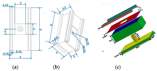 Dimension of custom-built sample chamber printed with 3D printer which houses detector circuitry (CR-10): (a) top view, (b) isometric view, and (c) 3-dimensional view (exploded). All dimensions in this figure are given in cm.