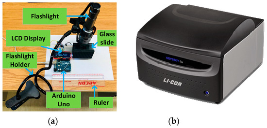 Experimental setup: (a) an overall setup of the proposed system (ruler is added in the picture to show the relative size) and (b) a commercial system: Li-Cor Odyssey.