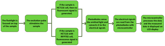 The complete system is powered and controlled by the help of a microcontroller (Arduino Uno). It detects the signal and transmits the measured signal to the LCD display. This microcontroller converts the analog signal generated by the photodiode using a high-precision 10-bit analog to digital converter (ADC) which is embedded inside the microcontroller. The photodiode is a semiconductor device which converts light into current [28]. The current is produced when the photons are taken up by the photodiode. In Arduino Uno’s ADC, the analog signal, which ranges from 0 to 5 V, is translated into a 10-bit code (1024 combinations) which corresponds to the analog value ranging from 0 to 1023. The Arduino Uno can read a maximum input voltage of 5 V, i.e., any voltage that is higher than 5 V will be read as 5 V regardless of their actual values. To remove this limitation, resistors of different values can be used to limit the voltage within 5 V. However, in this work, the obtained readings did not go beyond the maximum limit of the Arduino Uno as the generated fluorescence signal is not very strong. Figure 6 shows a flowchart which summarizes the working of the developed prototype. An Arduino IDE compiler is used to program the microcontroller. The code is written in C language. The device is initialized when it is first powered on. After the initial boot is successful, a sample of a control cell, which is cultured on a glass slide, is placed in the sample holder. The sample holder has a port which is designed to fit the cultured samples in it. After the sample placement is successful, the device starts reading. The microcontroller reads the data 10 times in order to reduce errors that may be caused due to manipulation, movement or placement of flashlight. The measured value is averaged, which is saved as a base value and displayed on the LCD display. This value will be used later in the calculation. It is to be noted that it is important to place the excitation source/flashlight on top of the sample, which is why a flashlight holder is used. The holder helps the user to hold the flashlight on top of the sample at the desired angle and distance away from the sample. After the reading of the control cell is completed, it is replaced with a sample of fluorescent colorectal cancer cell (HCT116 conjugated with IRFP702). As in the earlier case, the reading is performed again 10 times. This reading is averaged and compared with the previously measured value from the control cell. If the difference in voltage measurement obtained from the control cell and the fluorescent cell is greater than 700 mV, “CancerCell Found” is displayed. Otherwise, “No CancerCell” is displayed.