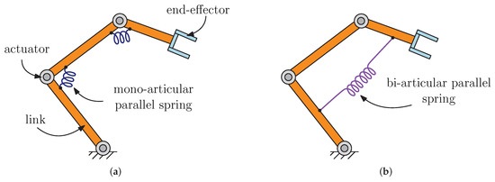 It is worth noting that there are two mounting possibilities for parallel springs, that is, they can be connected to just one joint, or they can span over two joints. In the first arrangement, largely adopted, springs are called mono-articular, whereas in the second, bi-articular (Figure 3). Bi-articular springs take inspiration from biological studies [68]—bi-articular muscles actuate human limbs as well as paws of birds, reptile and insects. Non-linear bi-articular springs are designed for example by B. Kim and A.D. Deshpande [67], by means of pulley-cable mechanisms and antagonist linear springs. Bi-articular springs are mostly employed in the realization of walking robot [69,70,71]. The effectiveness of such springs in serial manipulators to perform pick-and-place operations are investigated by G. Lu et al. [72] and H.J. Bidgoly et al. [73], with different conclusions. In the case of a variable linear bi-articular spring added on a SCARA robot, G. Lu et al. [72] conclude that such a spring alone cannot effectively save energy. Conversely, H.J. Bidgoly et al. [73] assert that bi-articular spring contribute more in the actuation cost minimization with respect to mono-articular springs, in the case of a redundant 4-DOF serial manipulator with non-linear mono- and bi-articular springs.
