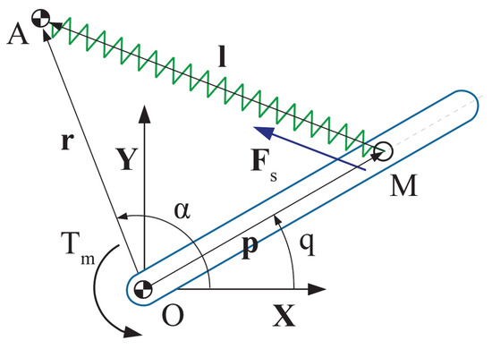 P. Boscariol et al. [89] set up a constrained optimization problem to find the optimal stiffness value and placement of a linear spring to be added in parallel with the joint actuator of a 1-DOF system for reducing the peak torque requirement (Figure 4). The authors also shown the effects of the joint trajectory (cycloidal motion trajectory and 5th order polynomial with null initial and final acceleration) on the optimization results.