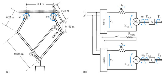 In Reference [90], G. Carabin et al. propose a methodology to reduce the electrical energy consumption in a Delta-2 robot by concurrently exploiting energy recuperation drive axles and torsional springs mounted in parallel to the actuators. Figure 5 reports the kinematic diagram and the electrical schematic of the Delta-2 robot. An optimization-based design method determines the stiffness of the two torsional springs and their equilibrium positions. The energy consumption performing cyclic pick-and-place operations, with a predefined trajectory (double-S speed profile in the workspace) is minimized.