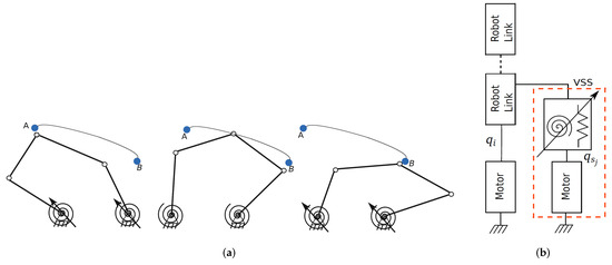 (a) Pick-and-place operation performed by a five-bar mechanism equipped with parallel variable stiffness springs (VSS). (b) Scheme of the VSS power transmission system employed by R.B. Hill et al. [91], where represents the i-th robot joint coordinate, whereas the j-th variable stiffness spring coordinate.