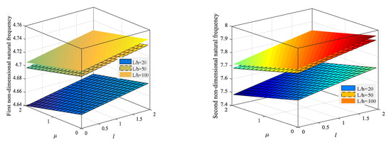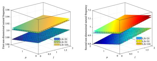 Thus, the same systematic study is repeated for a clamped-simply nanobeam, whose results are listed in Table 5 and are depicted in Figure 3, with the aim of understanding the role of the nonlocal parameter, the strain gradient parameter, and the nondimensional geometrical ratio L/h, in its vibration response. Based on a comparative evaluation of the response between the present case (clamped-simply supports) and the simply-supported case, a general increase in frequency is observed with respect to the previous example, due to the clamped boundary condition enforced on one side, and the general increase in stiffness of the structures. Moreover, an increasing nonlocality μ yields a decreasing structural stiffness, together with a general decrease in the fundamental frequencies. At the same time, an increase in the strain gradient l enables an increase in frequency, independently of the length-to-thickness ratio. Similar considerations can be repeated for the whole vibration modes here analyzed.