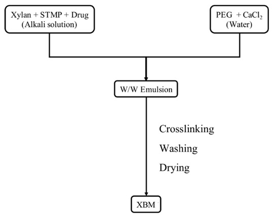 The 5-ASA-loaded XBM was prepared from an emulsion obtained by the previously mentioned phase diagram. The microparticles were produced following the flow chart presented in Figure 1. First, a solution containing 4%(w/v) of xylan, 1%(w/v) of STMP, and 0.05%(w/v) of 5-ASA was prepared. Simultaneously, a PEG solution containing 32%(w/v), with or without CaCl2, was also prepared. In the sequence, the xylan solution was slowly poured into the PEG solution to reach a proportion of 1:4(v/v), respectively. The dispersion was kept under constant magnetic stirring for 5 min and, then, incubated at 45 °C for 6 h [10]. Afterward, to cease the reaction and lead to microparticles precipitation, ethanol 98%(v/v) was added to the mixture. Then, washing steps were carried out by centrifugation (2136 g for 5 min) with ethanol 98%(v/v) and deionized water. Lastly, the 5-ASA-loaded XBM were dried at room temperature and stored at 25 °C.