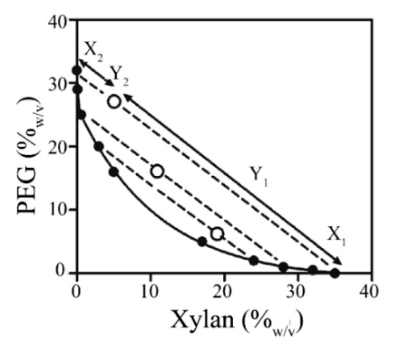 Phase diagram of xylan and PEG solutions. The solid line (–) represents the binodal line and the dashed lines (- - -) or the tie-lines. Below the binodal lines, the systems have just one phase, and, above it, the open circle (○) represents the point at which the phase separation occurs. X1 stands for the xylan dispersion at 40%(w/v), X2 is the PEG enriched solution 32%(w/v), and Y1 and Y2 represent the volume ratio of the two phases for the formation of the emulsions.