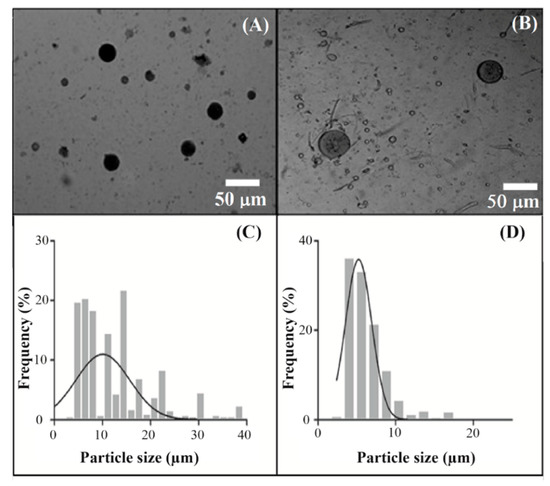 Similarly, based on XBM, the optical microscopy of the formulation XBM-Ca-F9 (Figure 3B) shows not only a spherical shape and absence of aggregates, but also a uniform distribution particle size (Figure 3D). In addition, the CaCl2 promoted a reduction of approximately 50% on the average diameter of the formulation, from 10.70 (for XBM) to 4.77 µm (for XBM-Ca-F9). As can be seen in the formulations XBM-Ca-F4 and XBM-Ca-F6 (Table 1), the increase of CaCl2 to 2%(w/v) promoted a decrease in the average particle size.
