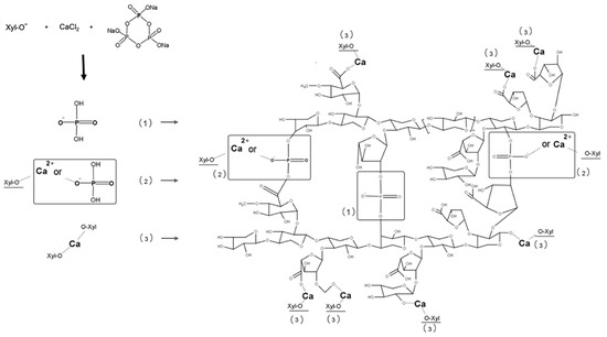 Scheme of the crosslinking reaction between xylan (Xyl), CaCl2, and STMP. Reaction (1) represents only the chemical bond between STMP-Xyl. Reaction (2) represents the process of chemical crosslinking between Ca2+-Xyl-STMP, respectively, and Reaction (3) represents the ionic interaction between Ca2+-Xyl.