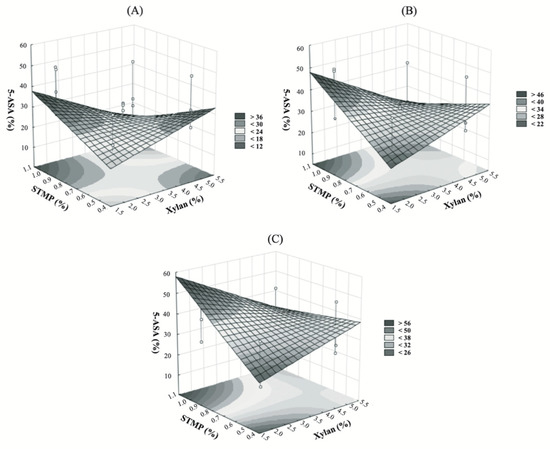 Additionally, the encapsulation of 5-ASA was enhanced at the lower level of xylan and at the higher level of STMP (Figure 5A–C). The particles formed within these concentrations likely have a smaller pore size due to the high crosslinking degree, which, consequently, improves the encapsulation of 5-ASA [25].