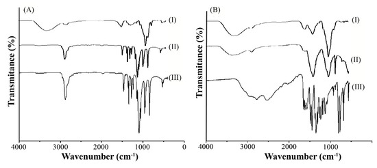 The xylan infrared spectrum was like other spectra observed elsewhere (Figure 6A (I)) [26,27]. Furthermore, it was observed that the spectrum of XBM and PEG (Figure 6A (II and III, respectively)) had similar peaks, likely due to the shielding effect presented by the PEG in the formulation. In fact, after the drying process, it could be possible that the PEG shielding effect form a film and prevent ATR-IR from analyzing XBM. On the other hand, in formulations containing CaCl2 (Figure 6B (I and II)), this phenomenon was not observed. It could be speculated that, likely, the CaCl2 play an important role at the interface of the microparticles, which hinders the shielding effect of PEG.