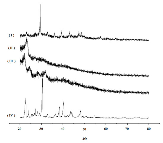 As reported in the literature, xylan XRD analysis (Figure 7 (II)) revealed the profile of an amorphous polymer [26]. Likewise, the diffractogram of the unloaded XBM-Ca-F9 (Figure 7 (III)) also revealed an amorphous structure. This result is very different from the previous reports of crosslinked xylan microparticles prepared with terephthaloyl chloride. However, this is commonly seen in STMP crosslinking products [28]. On the other hand, the diffractogram of 5-ASA alone (Figure 7 (IV)) showed very pronounced peaks at 22.5°, 30.6°, and 40.6°, which was also identified in XBM-Ca-F9 loaded with 5-ASA (Figure 7 (I)) XRD analysis. The presence of the peaks from 5-ASA on the XBM-Ca-F9 diffractogram reveals the association of the 5-ASA with the xylan through physical interactions. Once no new bound was identified in the ATR-IR analysis, there was only an enhancement of the peaks at the region between 1400 to 1600 cm−1, as previously discussed.