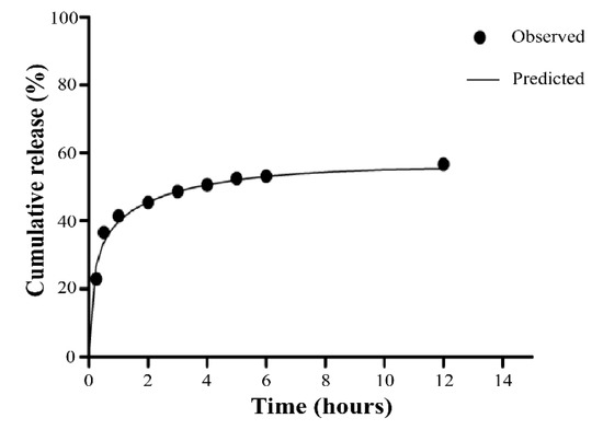 The mathematical modeling of the data from the drug release assay was performed using the Add-in DDsolver for Microsoft® Excel [18] in order to describe the mechanism by which the 5-ASA was released from the microparticles. The choice of the model that best fitted the experimental data was based on the adjusted coefficient of determination (adjusted-R2), which corresponds to the adjustment of the theoretical models to the experimentally obtained data. Additionally, the Root Average Square Error (RMSE) was used to evaluate the difference between the values obtained experimentally and those predicted by the model. Therefore, the model that best describes the experimental data was the one showing the largest adjusted-R² and the lower RMSE [18].