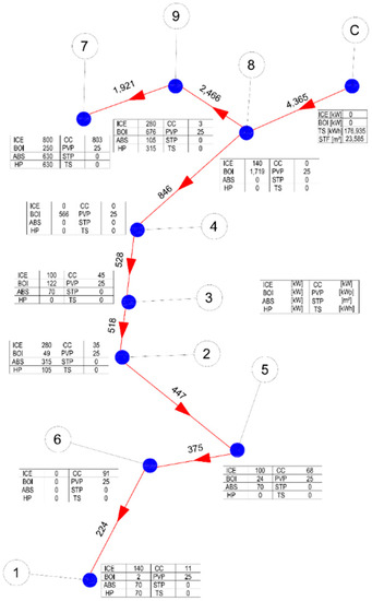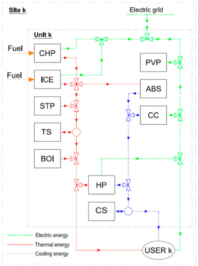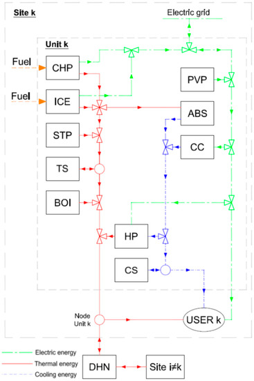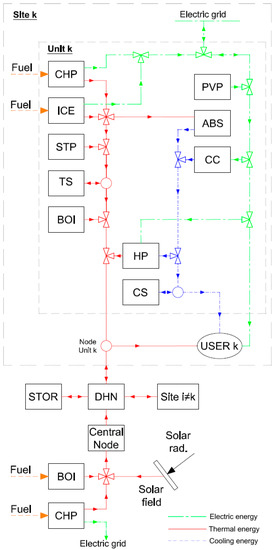 The superstructure proposed in this research is shown in Figure 1. The superstructure can be divided into two different parts: the superstructure related to each site; and the superstructure related to the central unit. The green, red and blue lines represent the physical distribution of electric, thermal and cooling energy, respectively, while the orange arrows represent the fuel inputs. Following each distribution line inside the site k, the electricity can be produced by internal combustion engines (ICE), by micro gas turbines (MGT) and by photovoltaic panels (PV), can be bought from or sold to the electricity grid, used by compression chillers (CC) and by the heat pumps (HP), while the rest is sent to the user k. The thermal energy can be produced by ICEs, by MGTs, by solar thermal (ST) panels, by boilers (BOI) and by HPs, can be stored in the thermal storage (TS), can be used by absorption chillers (ABS), can be send to the user k or to the DHN. The cooling energy can be produced by CCs, by ABSs and by HPs, can be stored in the cooling storage (CS), can be sent to the user k or to the district cooling network (DCN). The central unit can produce electricity by the centralized ICE, can produce thermal energy by the same ICE, by the central BOI and by the solar thermal field (ST field). The thermal energy produced in the central unit can be sent directly to the DHN and then to the users, or can be stored in a centralized TS and used later. The electricity produced in the central unit by the centralized ICE can only be sold to the electricity grid [22].