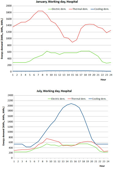 Equations (23) and (24) refer to the characteristic curve of the heat pump in the heating and cooling mode, respectively. The solar thermal collectors and the photovoltaic panels are modelled considering their production proportional to the size of the plants. The unitary production—Kstp(m, d, h, u) and Kpv(m, d, h, u)—is evaluated a priori considering inclination, orientation angle of installation and hourly solar radiation of the site of the plant.