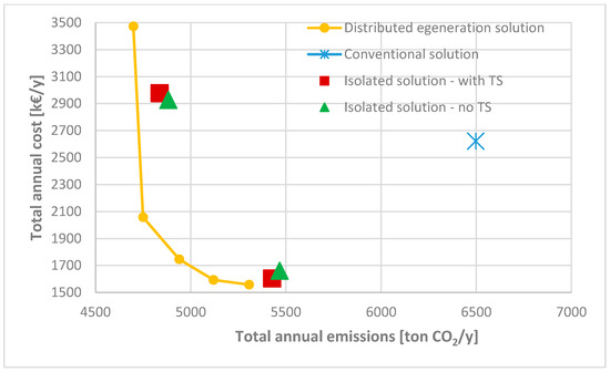 Some recent papers seem to go in this direction, performing a single objective optimization, generally economic: Chinese proposed a MILP model for the optimization of a DHCN in a DG context [14], Soderman and Petterson [15] presented a structural and operational optimization of a DG energy system. Pavicevic et al. [16] performed the optimization of sizing and operation of a DH system, focusing on the technological options for the TS. Pérez-Mora et al. [17] optimized DHC systems, focusing on the alternative between absorption and compression chillers. Ameri and Besharati [18] defined a model for determining the optimal capacity and operation of seven combined cooling, heating and power (CCHP) systems in the heating and cooling network of a residential complex located east of Theran.
