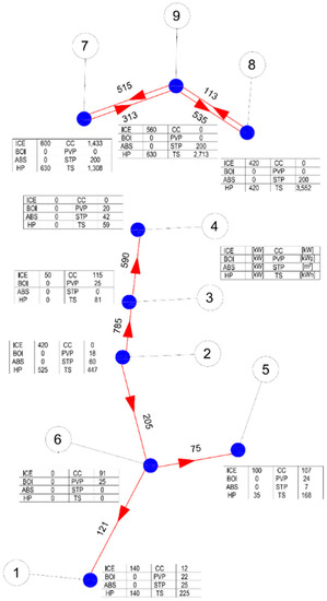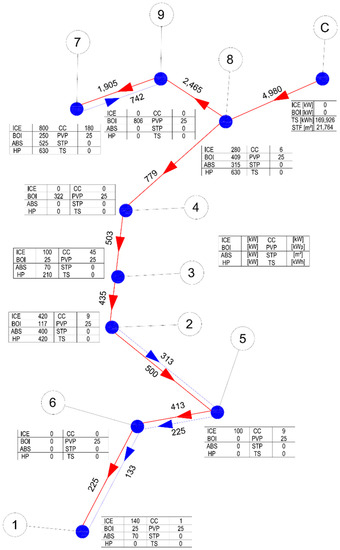 Assuming that the velocity vp is fixed, the transferred heat reported in Equation (28) depends on two variables, which are the cross section of the pipeline Ap and the temperature difference between inlet and outlet pipelines ∆t [28]. Assuming a fixed temperature of the network and a fixed temperature difference between the inlet and outlet, the modelling introduces a constant ratio between the size of the pipeline and the maximum flow which can be transferred, and considers the size and the layout of the network as decision variables, constrained by the pipeline super-structure and the flow rate limits of each pipe. The ∆t adopted normally ranges between 15–25 °C depending on the application, while the medium velocity vp ranges between 1.5–2.5 m/s. The thermal losses are considered proportional to the length of each pipeline through the coefficient δt: