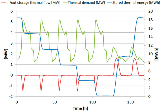 As well as for the DHCN, the temperature difference ∆t between inlet and outlet temperature is considered constant. Therefore, the thermal energy stored in the thermal storage is proportional to the volume of the medium inside the storage and it is considered as a decision variable. A set of equations is required to describe the energy balance of the thermal storage. In order to allow for the seasonal charging/discharging cycle, the thermal storage has to be modelled throughout the whole year, without any time decomposition as can be done for the other components, where a set of similar days can be represented by only one typical day. Applying the typical day approach to all operation variables, except for the variables which represent the energy stored in the thermal storages, allows us, in any case, to reduce the overall number of variables, keeping the option of properly representing the charge and discharge phases of the thermal storages during all the year.