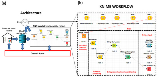 A research topic in telemedicine is the predictive diagnostic improved by artificial intelligence (AI). Different open source tools [1,2,3,4] such as RapidMiner Studio, Weka, Konstanz Information Miner (KNIME), Orange Canvas, Keras, TensorFlow, and Theano can be applied for this purpose, implementing generic artificial neural networks (ANN) predicting patient health status. These tools are suitable for decision support systems (DSS) based on artificial intelligence algorithms [5,6,7,8,9,10,11,12,13] predicting diagnosis [14,15,16]. Specifically in references [5,6,10,11,12,13] are discussed how data mining could support hospital and assistance processes, while references [7,8,9,14,15,16] provide different healthcare applications where artificial intelligence plays an important role in decision making processes enabled by health status prediction. Accordingly, with homecare assistance facilities for de-hospitalization processes, the use of certified smart sensors transmitting data in a cloud network could remotely control the patients at home [17]. The sensor enabling homecare assistance can be implemented into a more complex information hospital system embedding automatic alerting conditions based on different risk levels [18]. In this direction, KNIME workflows can be easily interfaced as a Graphical User Interface (GUI) to the control room information system, thus allowing the connectivity with big data systems and timing data process by cron job run managing the multilayer perceptron (MLP) ANN analyses [19]. In Figure 1a is illustrated an example information system basic architecture of the MLP ANN network linked with the control room and big data system for homecare assistance [19], and in Figure 1b schematized the related KNIME workflow by distinguishing the data process phases such as time delay for the workflow execution, python node enabling data input access, data pre-processing, data model processing, and reporting [19].