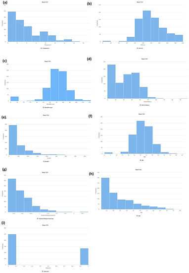 Based on several studies, we found that a commonly used dataset for health data mining was the Pima Indians Diabetes Dataset from the University of California, Irvine (UCI) Machine Learning Database [24,25,26,27,28,29]. The datasets consist of several medical predictor (independent) variables and one target (dependent) variable, Outcome. Independent variables include the number of pregnancies the patient has had, their BMI, insulin level, age, and so on: