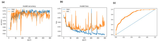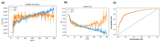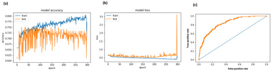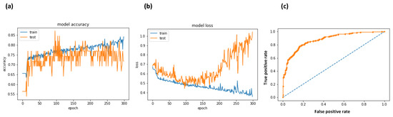 LSTM results (training dataset = 75%, testing dataset = 25%): (a) Model accuracy versus epochs; (b) model loss versus epochs; (c) ROC curve.