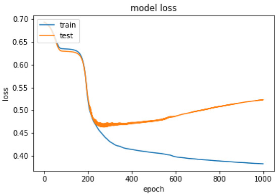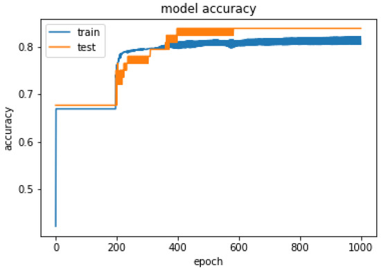 The best convergence was observed for the model accuracy of Figure 10, thus confirming that a good balancing between test and train model was achieved (case of testing dataset of 20%). Evident overfitting was observed in the model accuracy of Figure 9 related to 15% of testing dataset (no good balancing of parameters).