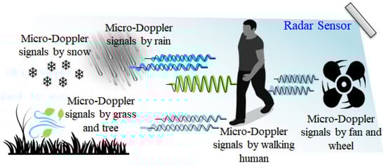 1]. In particular, since the speed of human walking is much slower than that of airplanes or vehicles, classifying micro-Doppler signals by humans walking from background noise signals can be a severe problem. Since the bandwidth of micro-Doppler signals of human walking motion can overlap the bandwidth of micro-Doppler signals of background noise, it can be challenging to filter two signals individually.