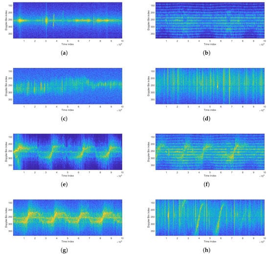 Figure 5 shows the experimental setup used to gather signals. The test site is an open space with no obstacles. We considered micro-Doppler signals caused by four types of background noise (Line of sight (LoS), fan, snow and rain). These noise signals can be understood as common background noises that can frequently be received in real outdoor environments. We additionally considered human walking micro-Doppler signals combined with these four types of background noise; that is, we gathered the eight types of signals in total whose examples are shown in