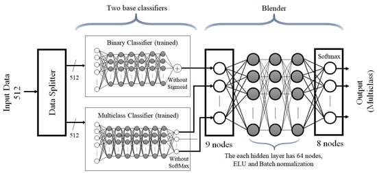 Figure 2b). The binary classifier determines whether there is a human walking in the detection area and the multi-class classifier is designed to classify eight cases individually. The blender is optimized after combining these two classifiers to improve classification accuracy performance.