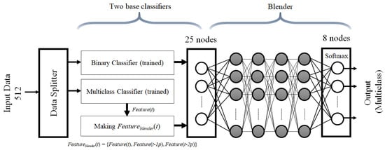 Figure 8 shows the structure of the modified stacking method. The modified stacking method stores and reuses the multiclass classifier’s outputs to reflect continuous variability of micro-Doppler effect over time. The multiclass classifier produces