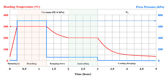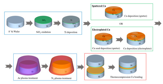 The process flow of a two-step plasma treatment on a Cu surface prior to Cu-to-Cu bonding is schematically illustrated in Figure 1. Both sputtered and electroplated Cu thin films were prepared on 700-nm-thick SiO2 in a 200-mm Si wafer. For the sputtered Cu samples, a 50-nm-thick Ti thin film was deposited in a conventional sputter (Sorona, Inc., PyungTak, Korea, SRA-110) under 5 mtorr working pressure and 2500 W power with 80 sccm Ar gas flow. Subsequently, a ~1-μm-thick Cu thin film was deposited under 5 mtorr working pressure and 2500 W power with 80 sccm Ar gas flow. For the electroplated samples, 100-nm-thick Cu as a seed layer was deposited on a Ti-deposited wafer followed by ~1-μm-thick electroplated Cu that was done in a manual electroplater (Sungwon Forming, Ansan, Korea, SW-PM2-R2Q1) with 2ASD (amps/square decimeter) current density and 6.48A current. Both the sputtered and electroplated samples were then subjected to two-step plasma treatment in a direct current (DC) sputter chamber. First, Ar plasma treatment was carried out for 30 s at an Ar gas flow rate of 150 sccm, radio frequency (RF) power of 100 W, and pressure of 7.5 mTorr. The samples were then treated by N2 plasma for 300 s at a N2 gas flow rate of 45 sccm, RF power of 200 W, and pressure of 7.5 mTorr. The process conditions for each sample are summarized in Table 1. After the two-step plasma treatment, Cu-to-Cu thermocompression bonding was performed at 300 °C under 7000 mbar for 1 h in a wafer bonder (SUSS Microtec, SB 8e), and the post-annealing process was undertaken at 200 °C under 200 mbar for 1 h. The bonding process temperature and pressure profile is shown in Figure 2.