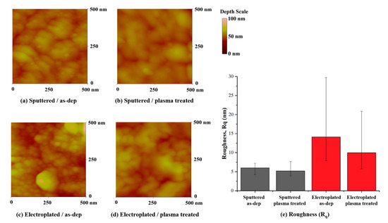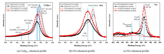 Further studies on the chemical states of copper, oxygen, and nitrogen were undertaken using the XPS (X-ray photoelectron spectroscopy) analysis shown in Figure 5. For the as-deposited sample, the Cu2p peak of the sputtered Cu and electroplated Cu in Figure 5a occurred at 932.18 eV and 932.28.7 eV, respectively. The peak at 932.2 eV may be linked to a pure metallic copper (Cuo) or the Cu1+ chemical state of Cu2O [18,19,20], but it is most likely related to Cu2O because the O1s peak at ~530.2 eV in Figure 5b indicates Cu2O state. After the two-step plasma treatment, it was found that the Cu2O peak at 932.2 eV had almost disappeared, and the CuO peak appeared at 934.08 eV in Figure 5a. In addition, the Cu2p binding energy of the sputtered Cu moved toward a slightly higher binding energy at around 932.58 eV than the electroplated Cu. In Figure 5b the O1s peak at ~530.2 eV had also disappeared, and the only strong OH-related peak at 531.2 eV appeared. The N1s peak observed at 397.38 eV in Figure 5c, and the Cu2p peak at 932.58 eV in Figure 5a, which is a higher binding energy than the chemical state of Cu0 and the Cu1+ of Cu2O, led to the formation of Cu4N at the surface. The qualitative analysis of nitride formation using Cu2p XPS survey data is summarized in Table 2. It is clearly showed that the sputtered Cu showed little more Cu4N formation than the electroplated Cu. This seems to be because the electroplated Cu thin film may have more copper oxide on the surface than the sputtered Cu thin film initially due to the electroplating process characteristics and has a high surface roughness (Rq) due to small grains. In Figure 6, the measured surface roughness by AFM confirmed that the sputtered Cu had a much lower roughness value than the electroplated Cu, as expected from the TEM results. After the two-step plasma treatment, the surface roughness decreased in both the sputtered and electroplated Cu surfaces. The XPS analysis strongly implies that the two-step plasma treatment sufficiently removed copper oxide on Cu surface and formed copper nitride to prevent further oxidation.