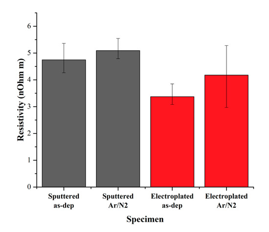 In order to confirm the resistivity changes by the plasma treatment, the sheet resistance was measured to estimate the Cu resistivity, and the results are shown in Figure 7. The resistivity of sputter Cu was higher than electroplated Cu due to a larger grain size. The very small increase in resistivity was observed in the sputtered Cu after the two-step plasma treatment, whereas the higher increase in resistivity was observed in the electroplated Cu. It has been reported that Cu4N tends to offer metallic behavior and Cu3N for semiconducting behavior, unlike copper oxides [21]. This means that the electroplated Cu has more oxide or less nitride formation than the sputtered Cu.
