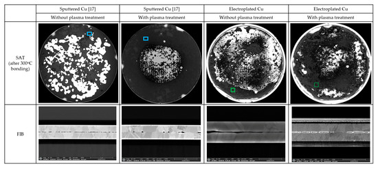 Following the two-step plasma treatment, the two plasma-treated Cu wafers were bonded at 300 °C, and then the bonding quality at the bonded Cu interface was evaluated using SAT (scanning acoustic tomography) and FIB (focused ion beam) analysis. In general, the darker the spot color in the SAT images, the better the bonding quality at the Cu bonding interface. In a previous report [17], the black spot in the sputtered Cu showed a complete bonded Cu interface with full Cu diffusion. In Figure 8, the as-deposited sample showed extremely poor bonding quality, but after the two-step plasma treatment, the bonding quality significantly improved in the sputtered Cu, and somewhat improved in the electroplated Cu with incomplete spot-bonded images. Considering that neither warpage control nor surface planarization by CMP (chemical mechanical polishing) was performed, the sputtered Cu exhibited a better bonded Cu interface than the electroplated Cu. In the XPS and AFM analysis, the sputtered Cu was observed to form more copper nitride and less copper oxide on the Cu surface and had lower surface roughness than the electroplated Cu. This may explain better bonding quality in the sputtered Cu. Despite the inherent problem of blanket Cu wafer bonding process in this experiment, the two-step plasma treatment has shown the possibility of preventing continuous copper oxidation and allowing low-temperature Cu bonding.