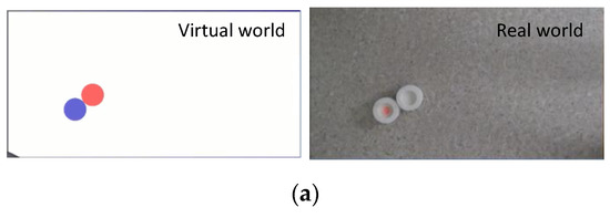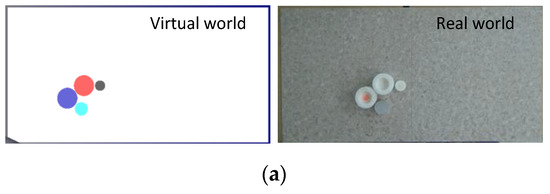 The scattering algorithm is explained in Figure 11. The initial positions of all objects are obtained from the real world and are fed to the virtual world. Then, the scattering experiment is performed in the virtual world until the desired distances among objects are achieved as defined in Equations (35) and (36). DAFUL [31] software, made of Virtual Motion Co., was employed in the virtual world simulations. Here, a feedback routine is employed to minimize the error between the desired distance and current distance by updating the colliding velocity of the robot manipulator. Once the error is within the allowed range, the objects are singulated. Finally, that same desired velocity will be given as the input to the robot manipulator and real-time scattering is performed. During experimentation, the minimum distance among objects is set as = 90 mm. The average maximum and minimum maximum distance is set as = 150 mm, = 900 mm. Once all physical parameters are estimated, based on the ratio of masses and coefficient of restitutions, the change in velocity is calculated by using Equations (33) and (34). Finally, Equation (30) is employed to calculate the travel distance of each object after collision. All estimated physical parameters will be used in this process. The scattering results between two objects are shown in Figure 12. Figure 12 shows two scenes; one from the virtual world and the other from the real world. Figure 12b shows the results after scattering. It was found from scattering experiment that the objects are singulated after controlled scattering and the results of singulation are similar in both cases. Figure 13 and Figure 14 demonstrate the case of three objects by considering the circular and general shapes, respectively.
