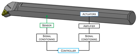 An active boring bar is composed of at least a sensor, capable of detecting the onset of the vibration to be mitigated, an actuator that generates counteracting forces based on a tailored control logic embedded in a real-time controller, as schematized in Figure 1.